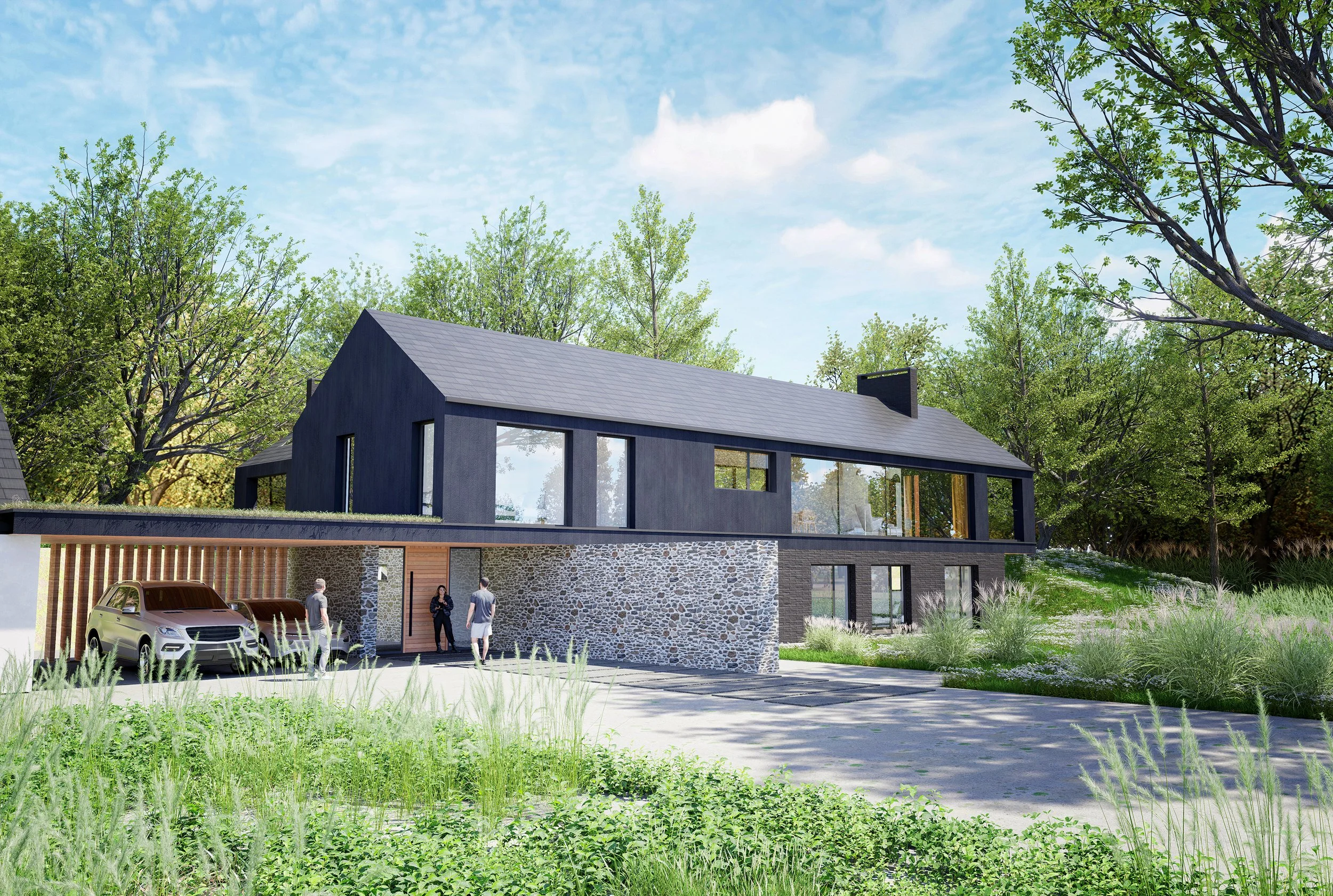 It utilises natural materials in the reuse of the existing stone from the old house, natural blackened larch cladding, brick and render. Large expanses of glass and covered terraces pull the outside space inside and maximises its aspect in all directions.
